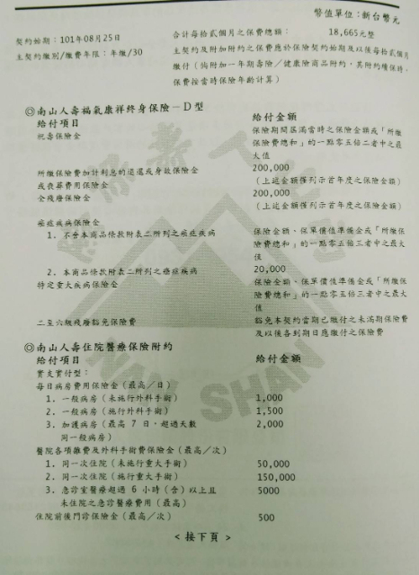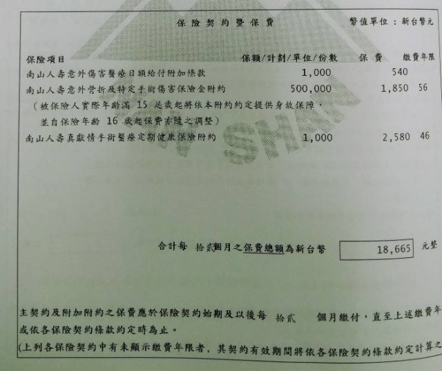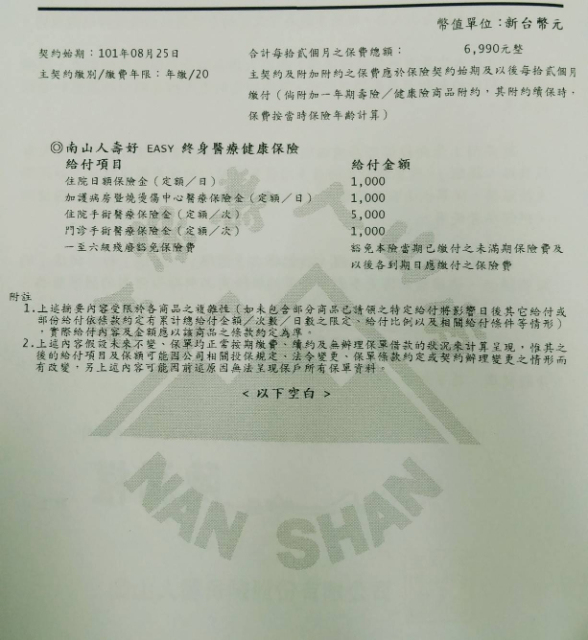 剛出社會時買了南山人壽的終身壽險(30年)和終身醫療(20年)